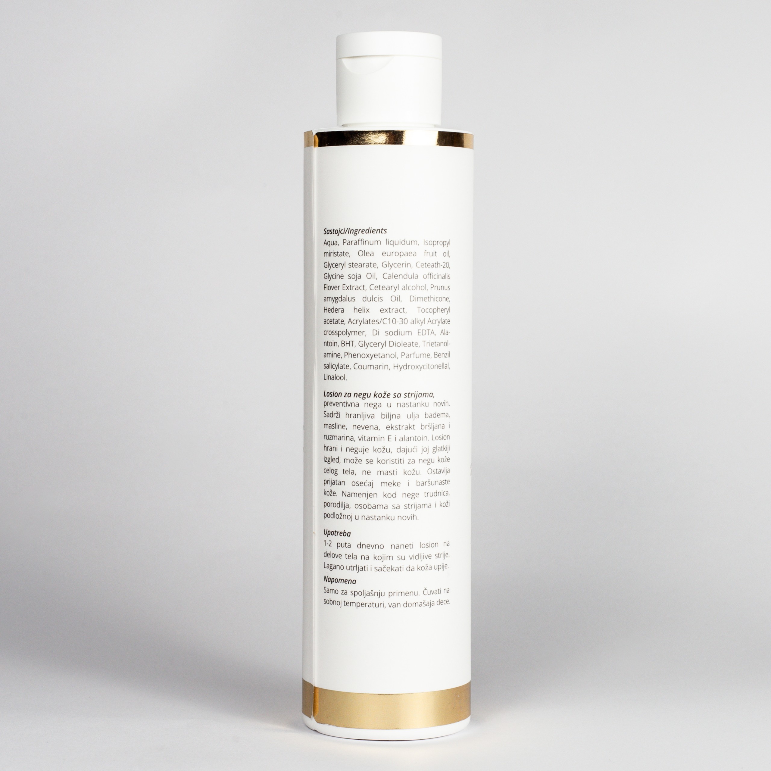 Upotreba: 1-2 puta dnevno naneti losion na delove tela na kojim su vidljive strije. Lagano utrljati i sacekati da koža upije.