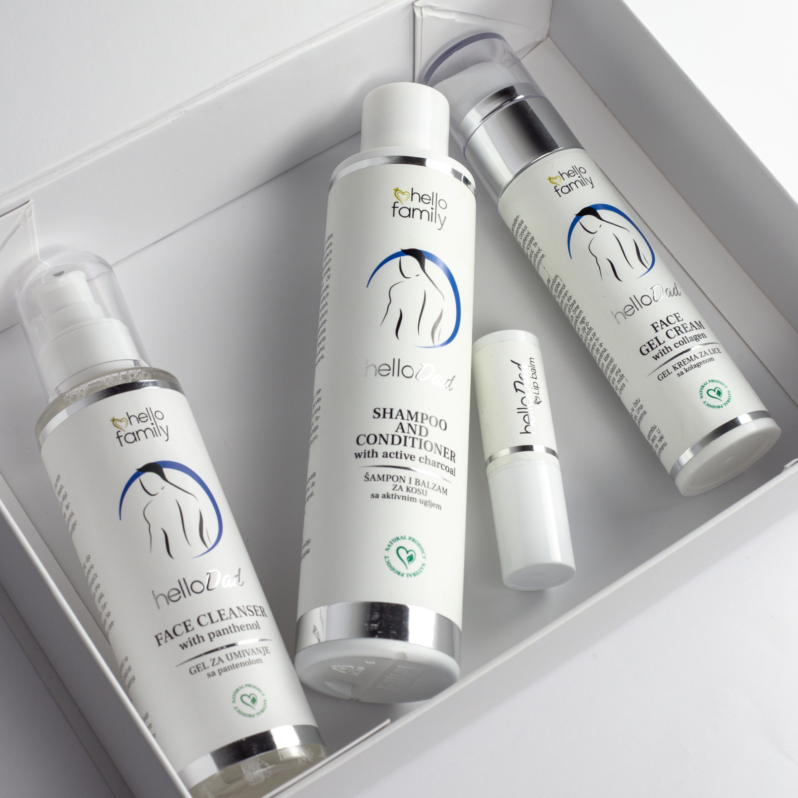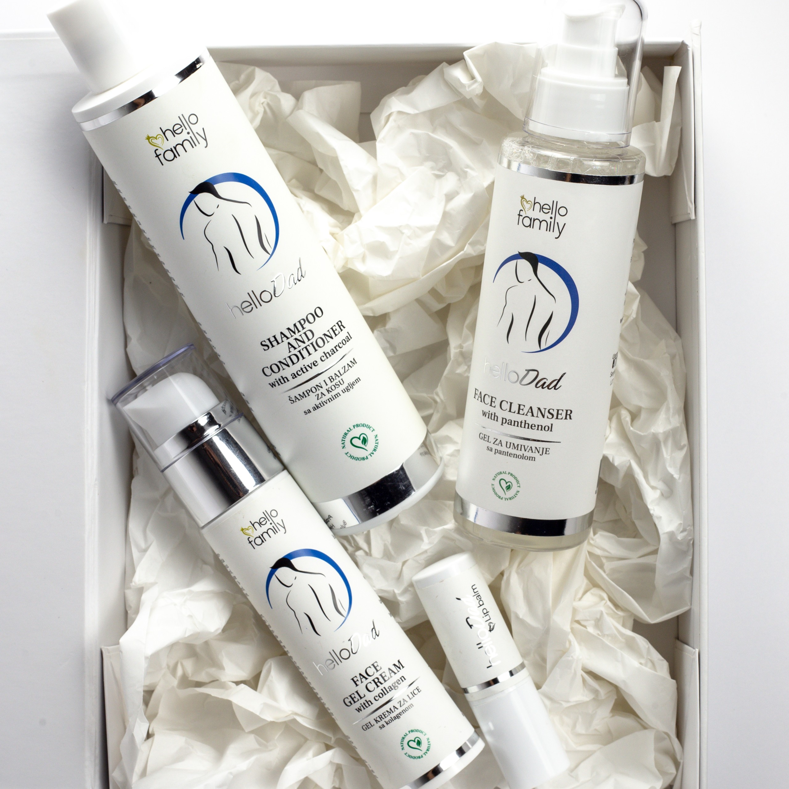 Poklon set za muškarce – 3 proizvoda za negu kose i lica + poklon labelo, u modernoj Hello Family kutiji sa magnetnim zatvaranjem.